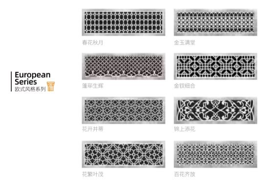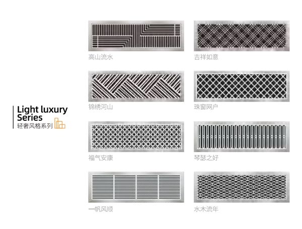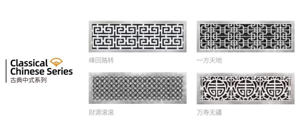 当国内中央空调开始普及,埃瑞德便自主设计了几十种花纹,供客户选择。中式花纹用的是能代表中华底蕴的图案加以设计,搭配传统中式风格、新中式风格的场景,以突显出空间的雅致。