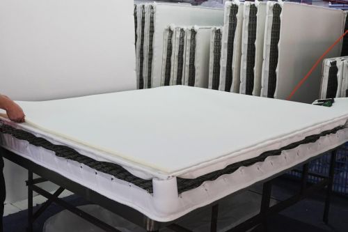 然后按顺序把各种填充材料、绗缝面料、弹簧床网排列组合,用物理方式缝制固定。