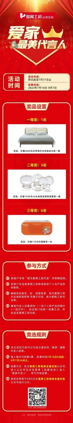夏日家装钜惠季,“星味”十足,爱阁工房全国征集“爱家”最美代言人,Show出“我为爱阁工房代言”的照片,价值6888元云梦瑚月水性漆实木床免费送!(新客户手持“我为爱阁工房代言”手举牌拍照,老客户在自家爱阁工房柜体前拍个人与产品的形象照,编辑竞选宣言,如:我爱我家,我为爱阁工房代言/即装即享 负离子空间,我为爱阁工房代言等,活动截止时间为8月7日,关注爱阁工房高端全屋定制公众号,点击菜单“品牌活动”进入“爱家代言人”即可上传照片参与活动并投票。)