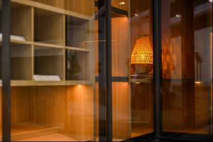 搭配上欧茶色的玻璃移门,让整个空间艺术的氛围感更浓烈了几分,在凸显出柔和细腻氛围的同时,也呈现出简练有力的线条,一强一弱的细节搭配,既烘托出强烈的主题氛围,又能释放空间的丰富性。