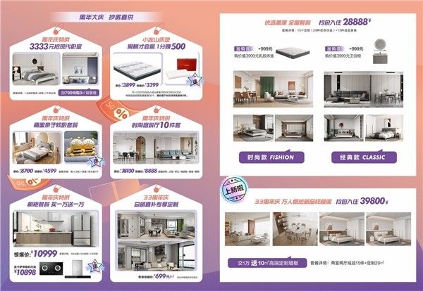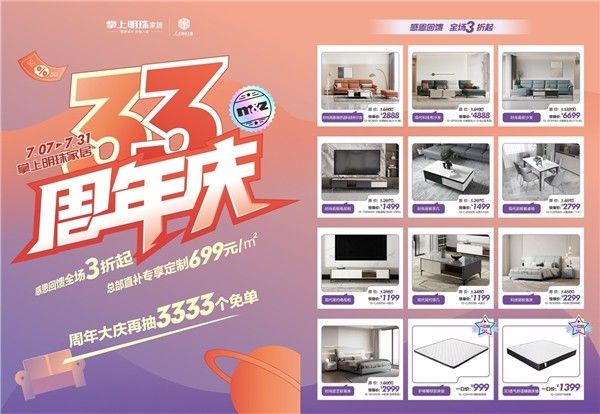 掌上明珠家居七月大促33周年庆,感恩回馈全场3折起,总部直补专享定制699元每平米,还有3333个超级免单下单抽。
