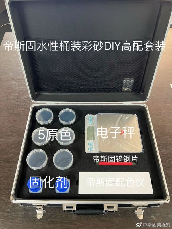 帝斯固同时推出水性桶装彩砂DIY高配定制套装!套装包含:定制箱子一个、钨钢片一把、电子秤一个、配色仪一台、五基色(红色、黄色、蓝色、白色、黑色)一组、固化剂两瓶。