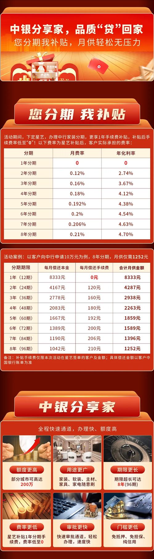 这次星艺装饰携手中国银行打造了第五届0首付月供家装节,精心筹备多重好礼,致谢业主朋友的信任与厚爱!活动期间,业主朋友办理星艺装饰&中国银行家装分期,即可享有1年手续费补贴,补贴手续费率低至“0“;办理家装分期【中银分享家】,优享六大优势!额度更高、用途更广、期限更长、费率更低、审批更快、门槛更低!