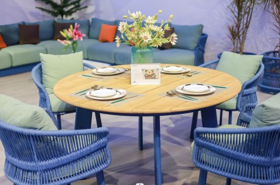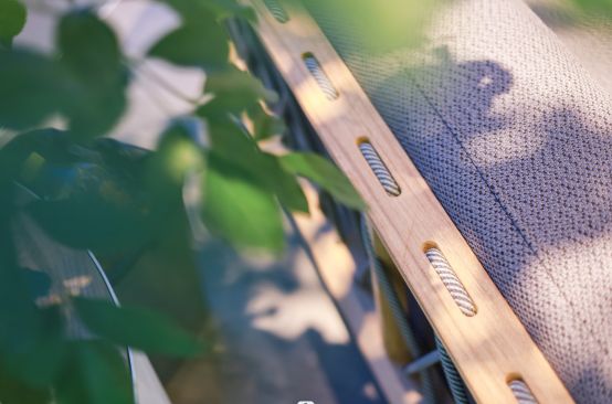 因此当你走过中国家博会(广州)上的悍高展位,很难不被悍高刚柔并济的解构主义美学实践所吸引驻足。在现场也展出了悍高的全新力作艾默尼系列,极具野奢气质,拍照与体验成为不少观众路过它时的固定动作。悍高艾默尼系列户外家具充分运用设计元素的对比并置,直线、曲线、棱角之间流畅过渡,形成具有高级趣味和想象空间的异形造型。沙发背部结合柚木与手工编织绳索,轻巧地钩织了具有自由灵魂的几何镂空设计,一扫传统户外沙发的枯燥感。系列中的多张沙发和茶几,可根据不同使用场景进行相互转换,富有人性关怀和互动感的原创设计,让户外家具从此也被赋予生命力。