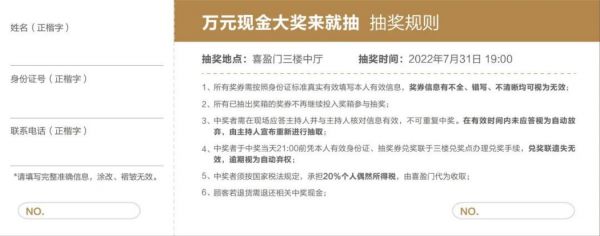 A:兑奖时间:2022年8月3日-8月7日,我的喜盈门会员中心自行兑换,逾期未进行免单兑奖,则视为自动放弃免单资格!