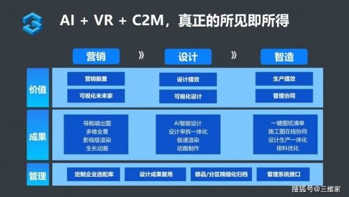 用户可对方案进行二次编辑,深化调整,报价下单,拆单生产,实现AI营销、AI智能设计到标准化部品、定制化部品的全屋配齐的数据闭环,运用AI+VR+C2M模式,实现真正的所见即所得。降低出图门槛,不止为了营销前置,更是为了直连后端,解放家居工厂、供应链联盟的生产力。以AI+VR图为载体,实现全链路C2M高效协同。