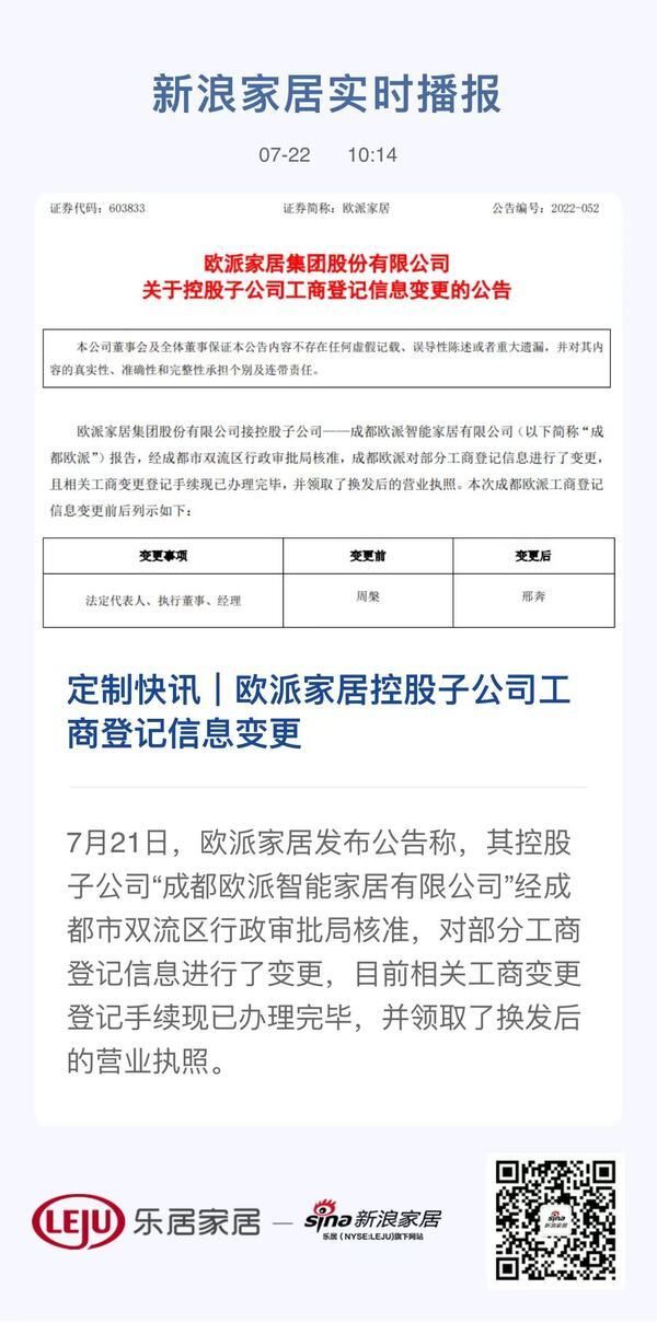 定制快讯|欧派家居控股子公司工商登记信息变更