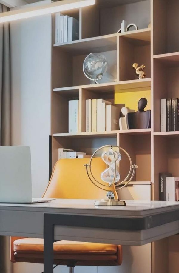 卧室的设计我最喜欢,他们在卧室的装饰上下了很大功夫,黄色的挂画使整个空间变得明亮,搭配一些金属灯饰,与客厅遥相呼应。墙面添加了很多灰色作为过渡,不仅有了现代简约的格调感,也让我们的卧室更富有层次。书房是我老公最看重的地方,因为身为工作狂的他呆在里面的时间最长,为了方便收纳,设计师在背景白墙处内嵌了一个等墙高的开放式书柜,白色的书桌搭配黄色的皮质座椅,可以让我们办公时变得更为舒适,暖黄色的灯光照在桌上的金属摆件上,使书房充满温和的气息。