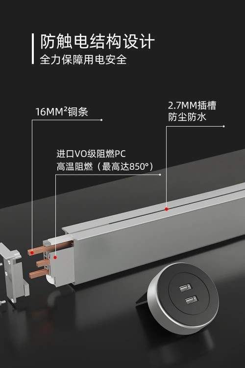 美沿轨道插座,打破传统插座,插孔少,线路短,功率低,导电不稳定,容易发热,甚至引发触电等问题。美沿轨道插座,采用防触电结构设计,纳米绝缘阻燃PC,耐高温达850°,从源头杜绝触电危险问题。16mm²纯铜条,让导电持续稳定,同时能够做到最大功率18000W,满足多种大功率电器同时使用,不必担心电器多,功率不够的问题。同时,轨道插座,灵活移动,适配器随心增减,让用电成为一种享受,而不是负担。