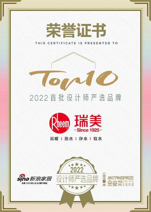 近日,由新浪家居联合金堂奖全国联盟共同发起的「2022 设计师严选品牌 TOP10」活动重磅启动,活动汇集了全国两岸三地数十位设计大咖担纲特邀点评嘉宾,并邀请全国千余名卓越青年设计师担任推荐官,将以设计师专业视角,甄选出服务于设计师及业主的高品质制造品牌。瑞美(Rheem)荣膺「2022 设计师严选品牌TOP 10」称号。