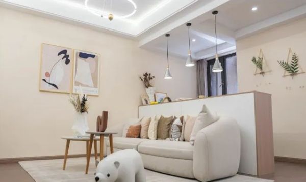 我媳妇儿对于原木风情有独钟,这在我追她的时候便已经知道了,所以跟设计师沟通装修风格时并没有太费时间,因为她主要原木。设计师根据所提风格以及我们房子的户型综合考虑后,肯定了它的可实行性。因为我们俩都比较喜欢慵懒的家居生活,所以为了让我们有更多放松、休闲的地方,设计师在客厅位置特地设计了一个吧台,上面则设计了三个高低不一的吊灯,银白色搭配黑色更显时尚感。客厅处的墙面与沙发均为白色,两款小巧的茶几放置中央,在底部铺设了一款白色地毯,搭配棕色地板让整个空间变得明亮。
