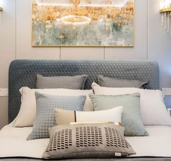 卧室方面大多采用了我媳妇儿的想法,墨绿配色的软床搭配白色床品,墙体位置全部采用了装饰板铺设,这样的卧室轻松、简约,而且打理起来也非常方便。为了呼应客厅装修,卧室部分也添加了挂画装饰,那种清凉的艺术感溢满整个空间。在床体一旁设计了一款等墙高的衣物收纳柜,大大提升了房屋的收纳能力,也为我们节省出更多使用空间,注重格调的同时也不忘实用性,这是我最喜欢艾佳生活的原因。