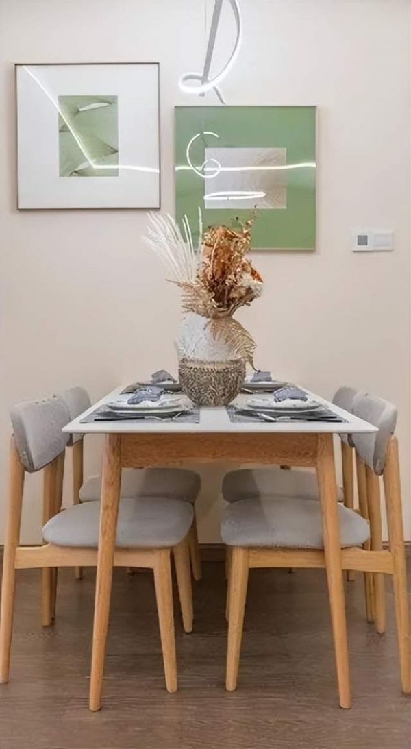 餐厨空间主打简约,厨房采用了L型厨台,白色大理石面尽显清新,顶部还设计了收纳柜,抽油烟机内嵌其中,厨房变得非常规整。餐厅位置放置了木质+大理石面的餐桌,并根据我们所需放置了四把餐椅,舒适的原木风格太符合我心意了。