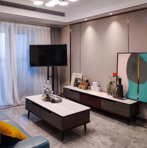 我购买的房子是108㎡的3室2厅户型,考虑到房子整体的户型,我最终和设计师定下了现代轻奢的装修风格。客厅部分选用了我喜欢的白、灰以及棕色调相互搭配,影视墙部分没有采用过于复杂的设计,只是在墙面处选用了不同颜色的装饰板区分,下面放置了一款简约的电视柜。而电视位置,设计师按照我的要求放到了客厅一角,并采用了可移动支架,满足了我随时随地打游戏的需求。