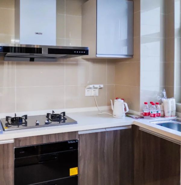 餐厨空间也是选用了棕色与白色,他们在厨房内部采用了L型动线设计,棕色的柜体搭配白色大理石厨台面,整体更为简约,厨房消毒柜等家电都采用了内嵌式设计,更加节省空间。厨房的墙面不是很大,但为了使其不空洞,在抽油烟机两旁各设计了一款吊柜,足以收纳我日常需要的一些食物。