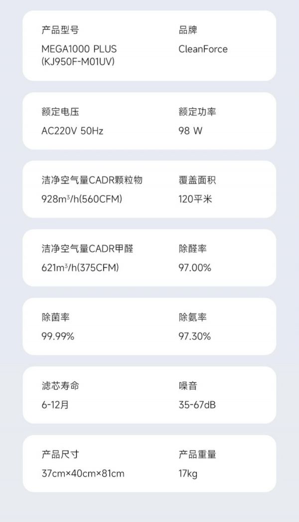 最后也附上CleanForce(科林弗斯)空气净化器的产品数据。