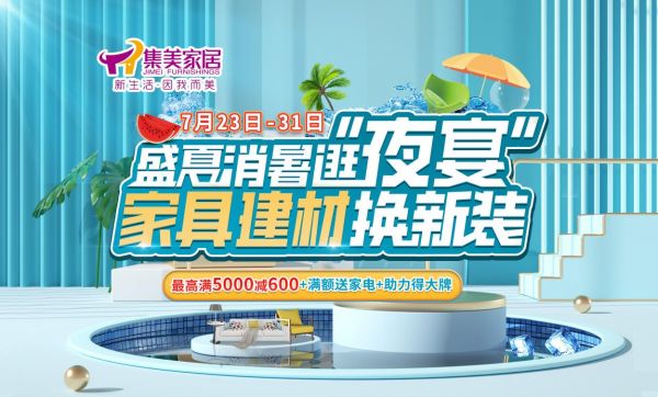 为让广大消费者享受到真正的实惠,度过一个舒心、凉爽的夏季,集美家居大红门、定慧桥、北苑三家商场联合推出“盛夏消暑逛夜宴家具建材换新装”优惠活动,7月23日-7月31日,全场每满5000元即可享受立减500元;7月30-31日消暑夜宴,补贴再升级:每满5000元立减600元,等你来购。