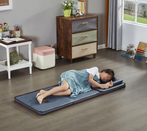 这款午休床垫采用三折叠设计,长度为一米五或一米八,宽60公分,厚度为50公分,重量轻盈,方便携带和收纳,适合学生在学校午休时使用。