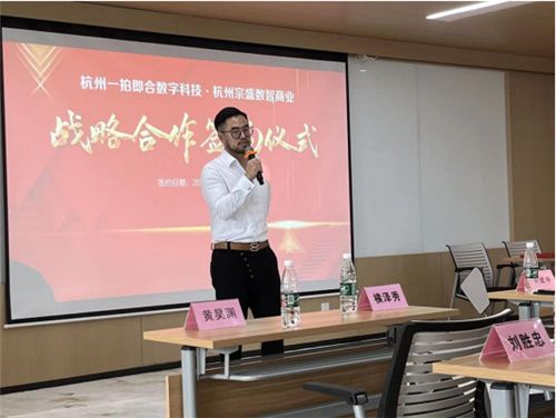 随后,宗盛数智商业(杭州)有限公司总裁吴坚和杭州一拍即合数字科技有限公司董事长周建中作为双方代表,正式签订战略合作协议书,在场领导和团队见证了签约仪式。