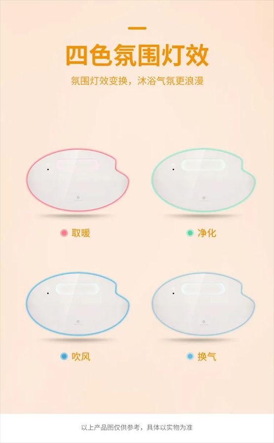 氧爸爸氛围灯,四种颜色选项,蓝色换气/绿色净化/红色暖风/浅蓝色吹风,颜色与功能结合,开启洗浴新体验,让浴室不再单调,沐浴气氛更浪漫。
