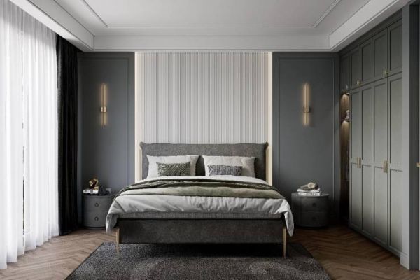 主卧整体布局上,以柜体作为隔断,就寝、妆造动静分区,起居各不干扰,搭配同色系皮质软床,外观造型和谐统一。