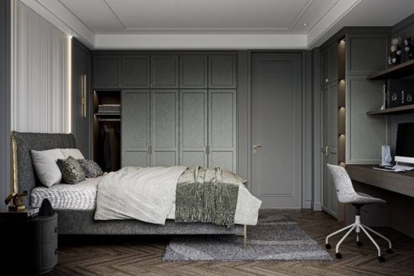 次卧衣柜以石莲绿门板为主,右侧按需设计长衣区、短衣区和叠放区。左侧的开放格作为点缀,外观造型上更为丰富,还解决了储藏空间的“盲区”,规避床头柜与衣柜柜门相撞的问题。床对侧书桌柜一体式设计,收纳、学习、办公、娱乐,多种功能、一屋实现,为生活解锁更多可能性。