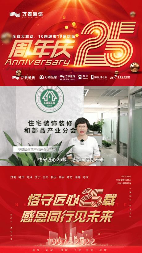 与此同时,中装协住宅产业分会胡亚南女士、山东装饰协会秘书长申广勇先生特别为万泰25周年送出祝福。万泰明星客户斗鱼游戏主播旭旭宝宝、抖音主播翟北北及业主代表也相继发来祝福视频,为万泰25周年助力赋能,他们因为选择万泰装饰而拥有了美好家装,品质生活。在25周年庆来临之际,万泰装饰也以更优质的家装服务,更专业的家装设计、施工、售后,来回馈广大客户的信任。