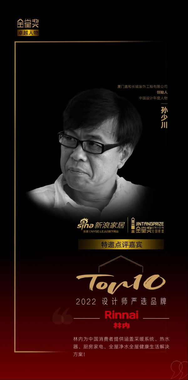 金堂奖卓越人物、厦门嘉和长城装饰工程有限公司创始人、中国设计年度人物、金堂奖全国特邀点评嘉宾孙少川对林内上榜表示祝贺,并点评道:林内为中国消费者提供涵盖采暖系统、热水器、厨房家电、全屋净水全屋健康生活解决方案!