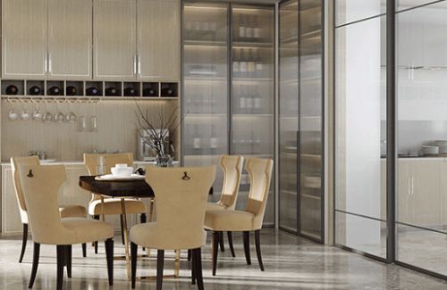 餐厅方面,玻璃柜门与开放空间更添设计感,实现隐藏储物和外露陈列的双重功能,既满足不同储物需求,也用留白给生活带来更多发挥空间。