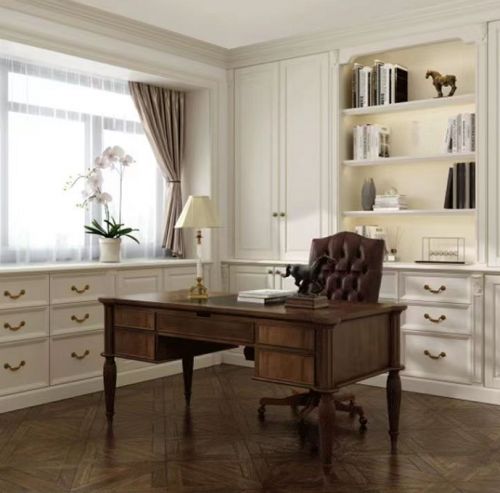 书房方面,美克美家根据用户审美需求和功能要求,完成定制的墙面储物柜、搭配木质书桌,体现不一样的书房美学。