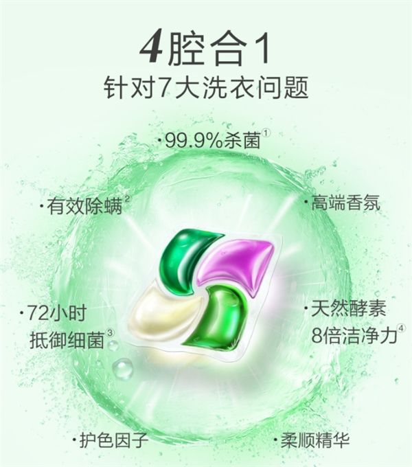 从使用是否便捷的角度来说,洗衣凝珠的优势是比较明显的,小小一颗拿取轻松,放入洗衣机即可,无需倾倒,也不存在漏液苦恼。洗衣凝珠的透明外膜是水溶性的,在遇水后会快速融化,因此无需撕开,使用起来非常方便。洗衣凝珠和洗衣液哪个好?小小一颗洗衣凝珠的洁净能力真的能与洗衣液抗衡吗?在这方面,选对产品是关键。滴露4合1除菌洗衣凝珠拥有8倍洁净力,其中添加了天然去渍酵素,强效去污,一颗即可轻松清洗全家衣物。