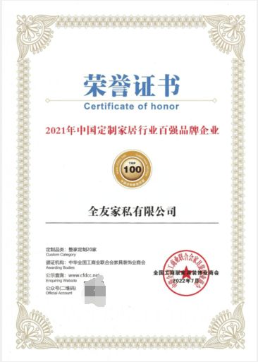 全友荣获“2021年中国定制家居行业百强品牌企业”荣誉称号