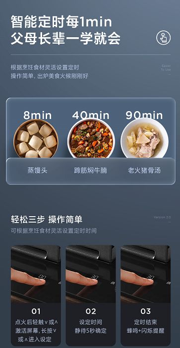 美的二代防干烧燃气灶Q519s-M具备智能定时功能,能够根据不同烹饪方式设定响应时间,0-99min范围内随心定时,让爸妈烹饪时,无需时刻守候在灶前,定时后即使在客厅看电视,也不担心锅里煲汤情况,让火候与鲜度刚刚好,下厨更省心。