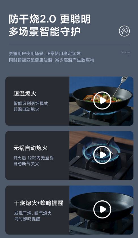 此外,它还支持多场景智能识别烹饪模式,在超高温度下会自动熄火;开火后,120s内无坐锅,会自动断气关火;发现干烧情况,会立即断气熄火,同时会蜂鸣提醒用户,让爸妈轻松下厨,无需后顾之忧。