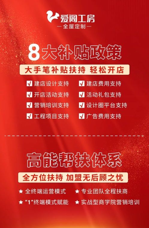 2022已过半,如果你看好全屋定制行业,选择一个有实力的好品牌很关键,想入局,不妨看看爱阁工房,选对赛道,选好品牌,撸起袖子加油干,财富抢先一步!爱阁工房立于整家定制的时代浪潮之上,将携手每一位爱阁家人,赢得未来,赢定未来!