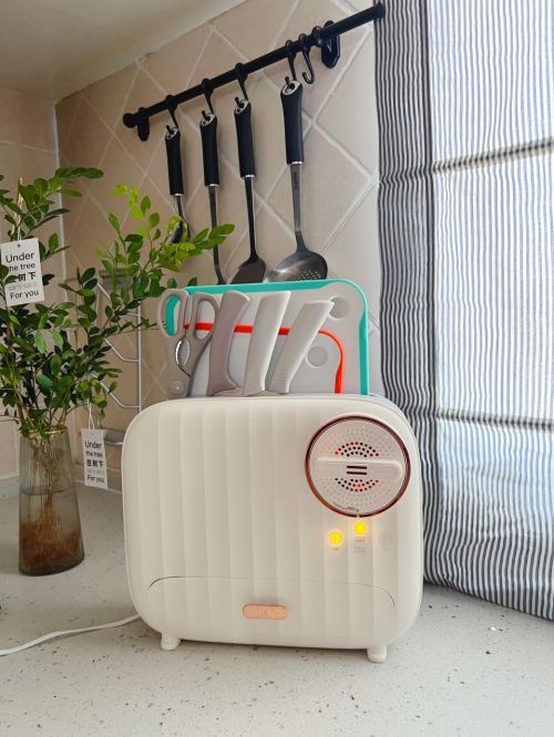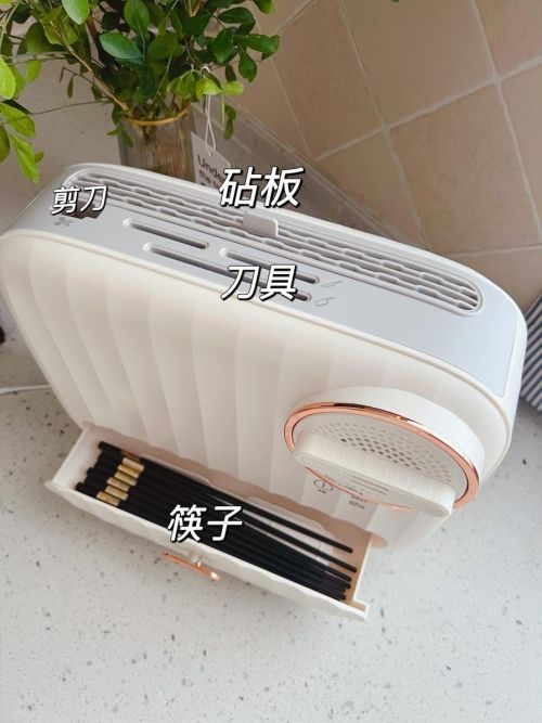 这个消毒机容量大,4把刀、厨房剪刀都放得下。独有“高温舱”设计+高效风道设计,消毒机吹出热风的位置在机器底部,通过均匀分布的热风烘干舱里的物体。而到达上出风口的位置时,还能保持在65℃,妥妥地满足灭菌的要求。还有UV杀菌灯加强杀菌,消毒效果确保每一个角落、刀具厨具的每个地方都可以很好的杀菌消毒。