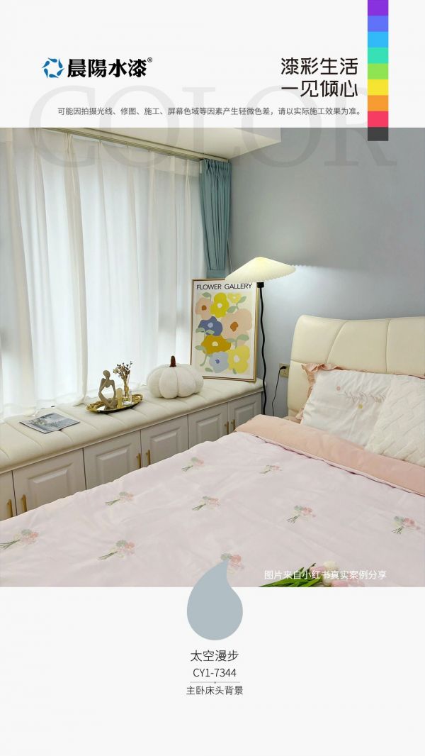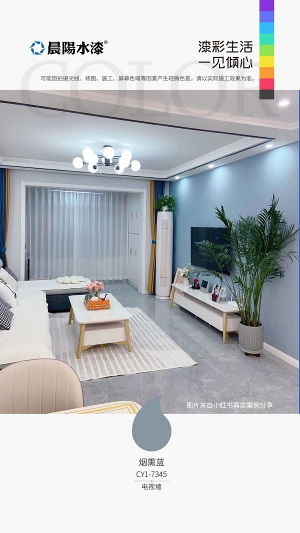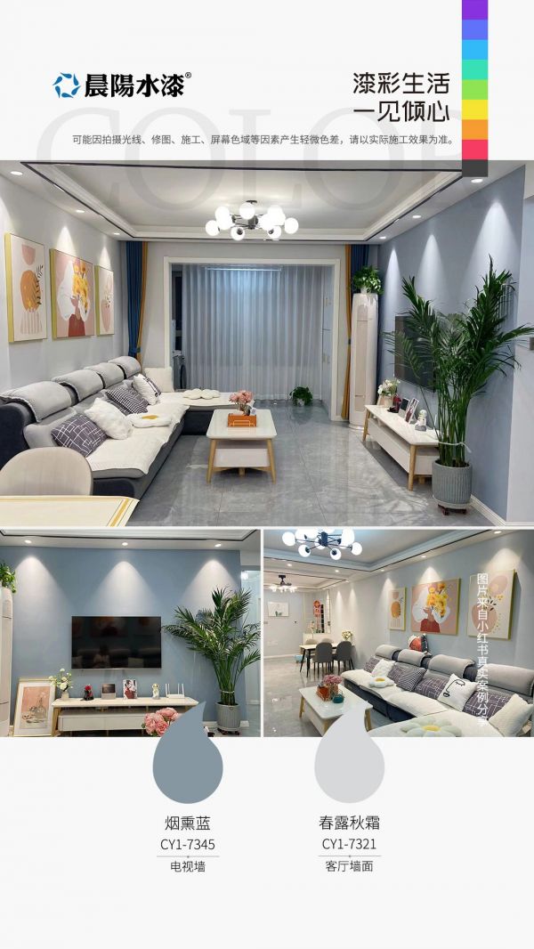 (1)我家客厅整体是晨阳水漆烟熏蓝(CY1-7345)色号,装修的时候纠结大面积刷太空漫步(CY1-7344)还是春露秋霜(CY1-7321),直到看到师傅现场调试的颜色,果断选了春露秋霜。