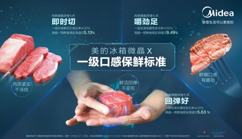 为满足消费者对食材保鲜的升级需求,美的冰箱微晶X带来全新突破。最新的微晶一周鲜,对温度监测系统、数据云计算系统、送风控冷系统进行了全方位升级,通过毫秒级雷达感温、V-TECH智能云保鲜和柔和环抱送风,微晶X得以拥有更多更全的数据算法,精控原鲜口感每一“度”,肉类水产等食材达到7天原鲜的同时,还进一步提升了鲜、嫩、润、滑、弹的口感体验。“美的冰箱微晶X”还凭借硬核保鲜实力,获得中国电器科学研究院·CVC威凯颁发的“一级口感保鲜标准认证证书”