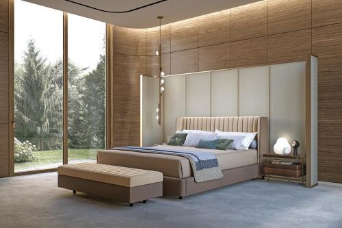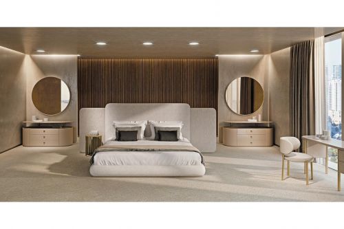 DOMUS床以舒适的比例营造轻盈的视觉美,床头采用独特的弧形设计和垂直接缝,点睛之笔是简约的床头柜和梳妆台,金属与木的碰撞,窥见传统与创造。