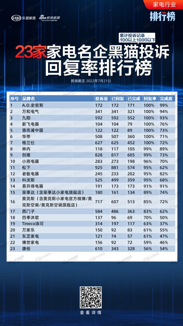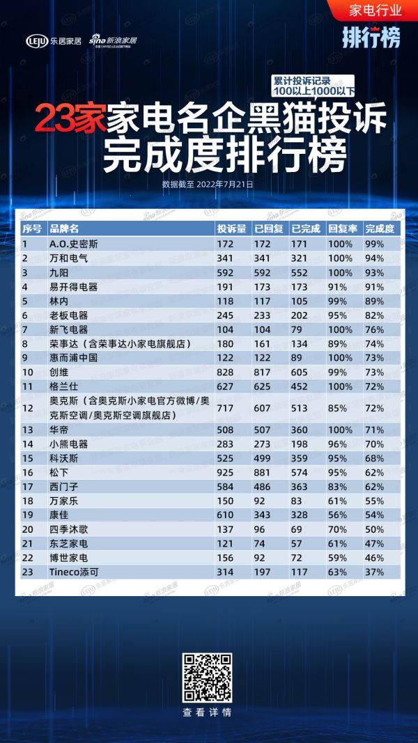 近日,新浪旗下的消费服务平台「黑猫投诉」公布了7月家电企业几组投诉榜单,本榜单完全依据黑猫投诉平台现有最新累计投诉及回复率、完成度情况统计而出,其中18家企业实现投诉信息回复率100%,9家企业实现投诉信息完成度90%以上,4家企业实现投诉回复率及完成度均为100%。