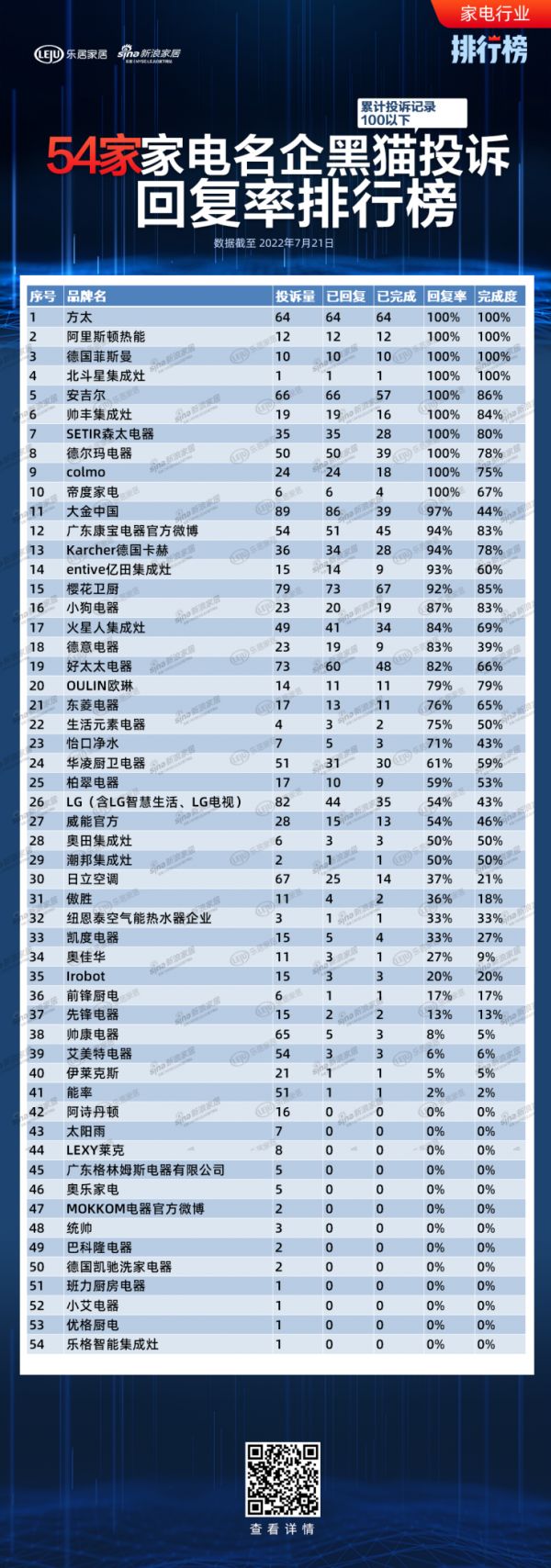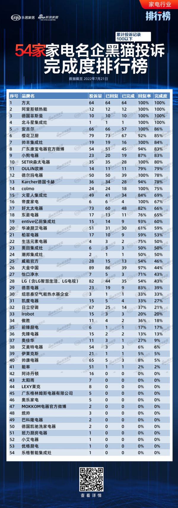 为帮助广大消费者更及时直观了解到家电品类商家服务质量,2022年1月1日起,新浪家居家电事业部每周根据最新数据汇总统计家电名企黑猫投诉完成度排行榜,借此显扬急速响应、急速反馈、妥善解决消费问题的企业,也警醒面对消费投诉不作为或懒作为的企业。