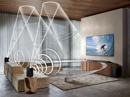 好马配好鞍,好电视当然也要搭配好音响。试想居家闲暇之余,拉上窗帘,打开一部战争片,感受炮弹落地发出的低频轰击与穿透力,超强低音不断冲击你的心灵;再打开一部武侠片,飞刀破竹的破裂声从耳边呼啸而过,环绕音效带来的沉浸感向你奔赴而来,这样的体验岂不美哉?三星Neo QLED系列电视搭配三星条形音响,可以给予你意想不到的声音体验。