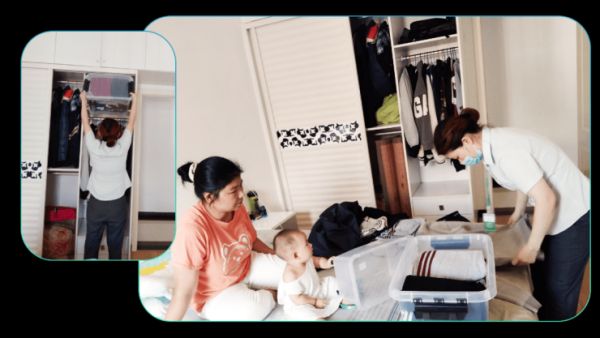 另一名工作人员在询问完她的物品实用习惯后,开始对物品进行分类整理收纳。服装按照季节、颜色、长短进行收纳;小件物品按照使用频次放在不同位置。很快,杂乱的衣橱和拥挤的客厅变得井井有条。