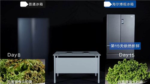 如何理解储鲜场景中的“保鲜时差”呢?可以分为两大维度:首先,看食材外观。从实验视频中可以看到,实验员拿出相同状态的叶菜,分别放入海尔博观冰箱和普通冰箱中,普通冰箱中的叶菜在第8天出现腐坏,而博观冰箱中的绿叶菜第15天仍然鲜绿。可见,在果蔬存储上,博观冰箱带来的“保鲜时差”为7天。