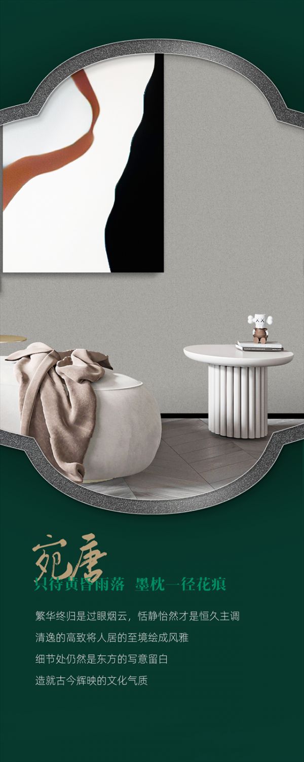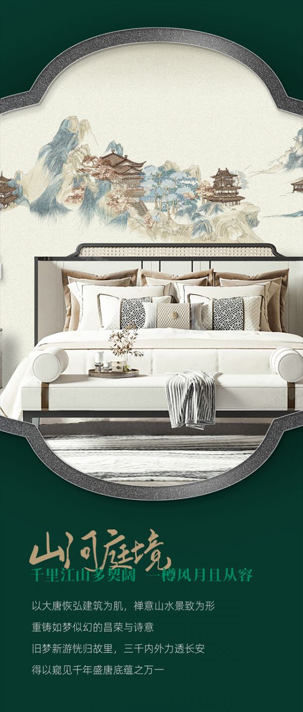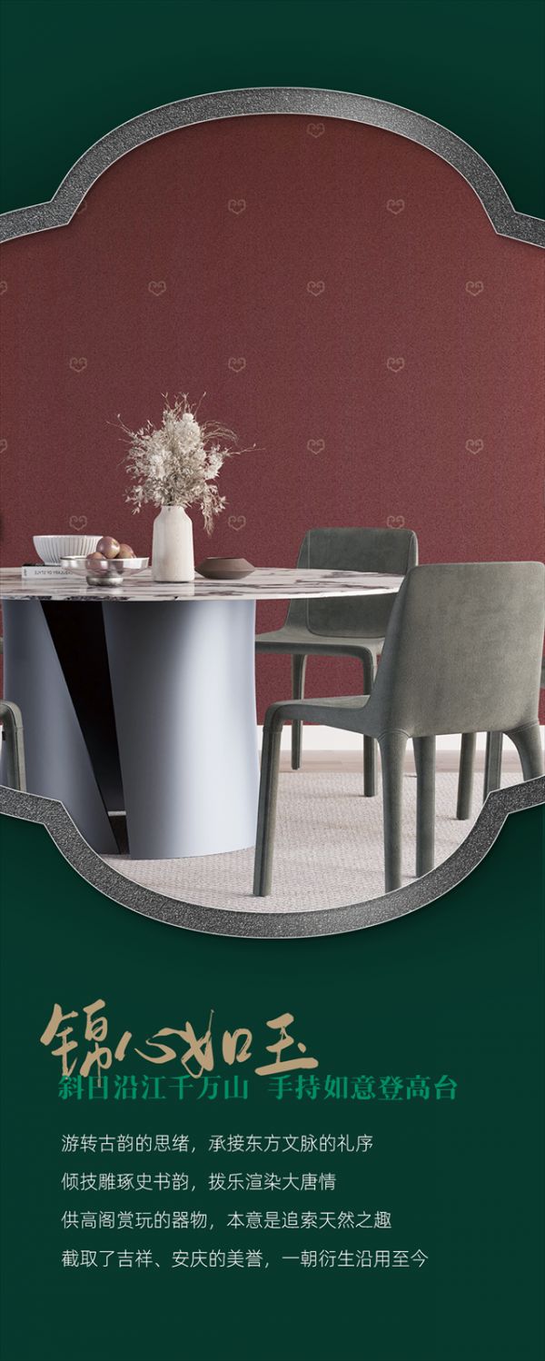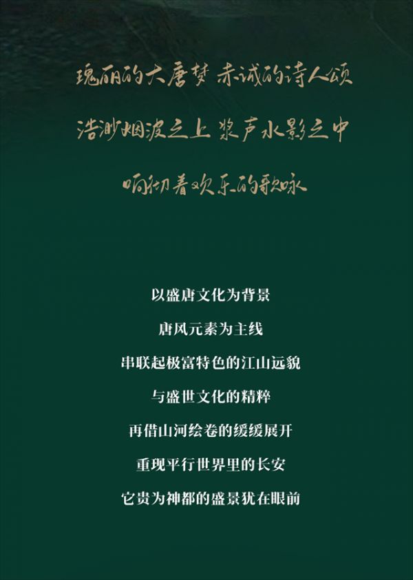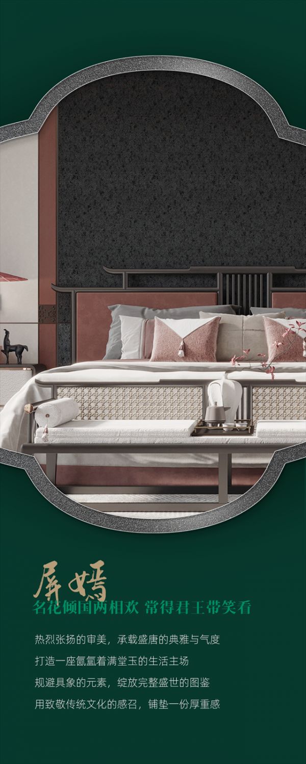 该版本是一个描写唐朝盛世江山和唐代生活的版本。大唐盛世是中华民族悠久历史中最为辉煌的篇章。大唐政治开明,思想解放,人才济济,疆域辽阔,在当时世界上是无比的繁荣昌盛。该版本在弘扬中国传统文化的同时,激起了现代人的情感和文化共鸣。版本中以唐代江山图为灵感来源,借唐三彩的色调再次发挥创作,使原本古典的艺术风格更为现代,符合现代的家居环境。又概括抽象出唐如意的图案作为绣花产品,更加丰富了室内空间。