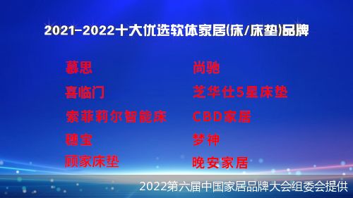 2022第六届中国家居品牌大会2022年7月31日在北京举行,现场发布36个“2021-2022中国家居十大优选品牌”榜单,尚驰家居上榜“2021-2022十大优选软体家居(床/床垫)品牌”。