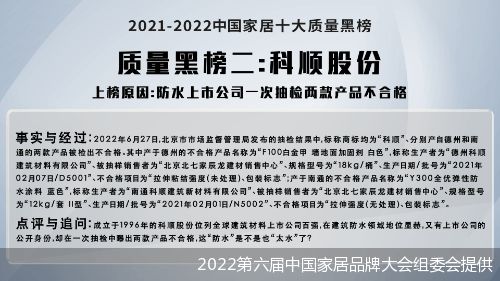2022第六届中国家居品牌大会2022年7月31日在北京举行,公开发布“2021-2022中国家居十大质量黑榜”,其中科顺股份与兔宝宝、三雄极光、华润漆、宜家家居、高仪、欧泰卫浴、创运工贸(金佰鑫&合家利)、科裕智能锁、光明园迪一道成为这一个年度的十大质量黑榜主角。