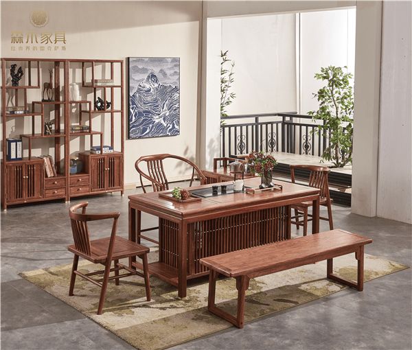 森木家具从传统东方神韵中汲取灵感融入当代设计中,一桌一椅之间、一转一折之际,打造了独特的造型美感,渲染出一片文静的气息,展现了一个精致素雅的刺猬紫檀新中式茶室。