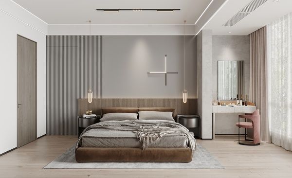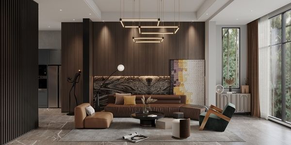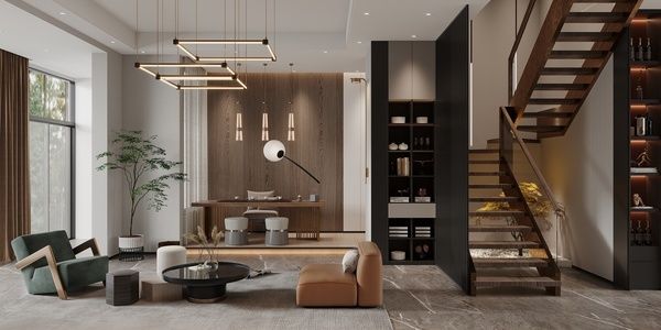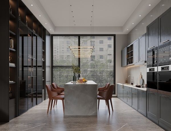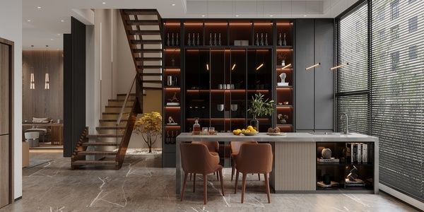 这是一栋坐落在市美术馆边上的复式,一个充满艺术气息的环境。在设计中摒弃了奢华的材质与复杂的造型堆砌,用大花纹的深色岩板作为点缀,展现艺术文化。木饰面贯穿空间的各个角落。顶上简约的天花造型四周散落柔和的光晕笼罩了整个客厅。深灰色的到顶餐边装饰收纳柜与中岛台式的餐桌结合,使餐厅空间突显出平和的就餐环境。时尚,典雅,特立独行的空间,只有真正懂得欣赏的人才能享有。