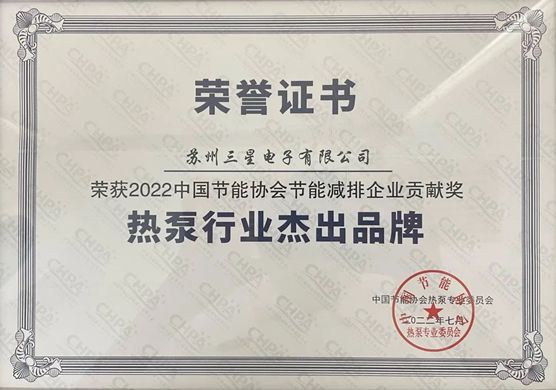 三星中央空调凭借雄厚的科研技术团队及优质的服务体系,获得中国节能协会热泵专业委员会的认可,荣获“2022中国节能协会节能减排企业贡献奖”热泵行业杰出品牌称号。